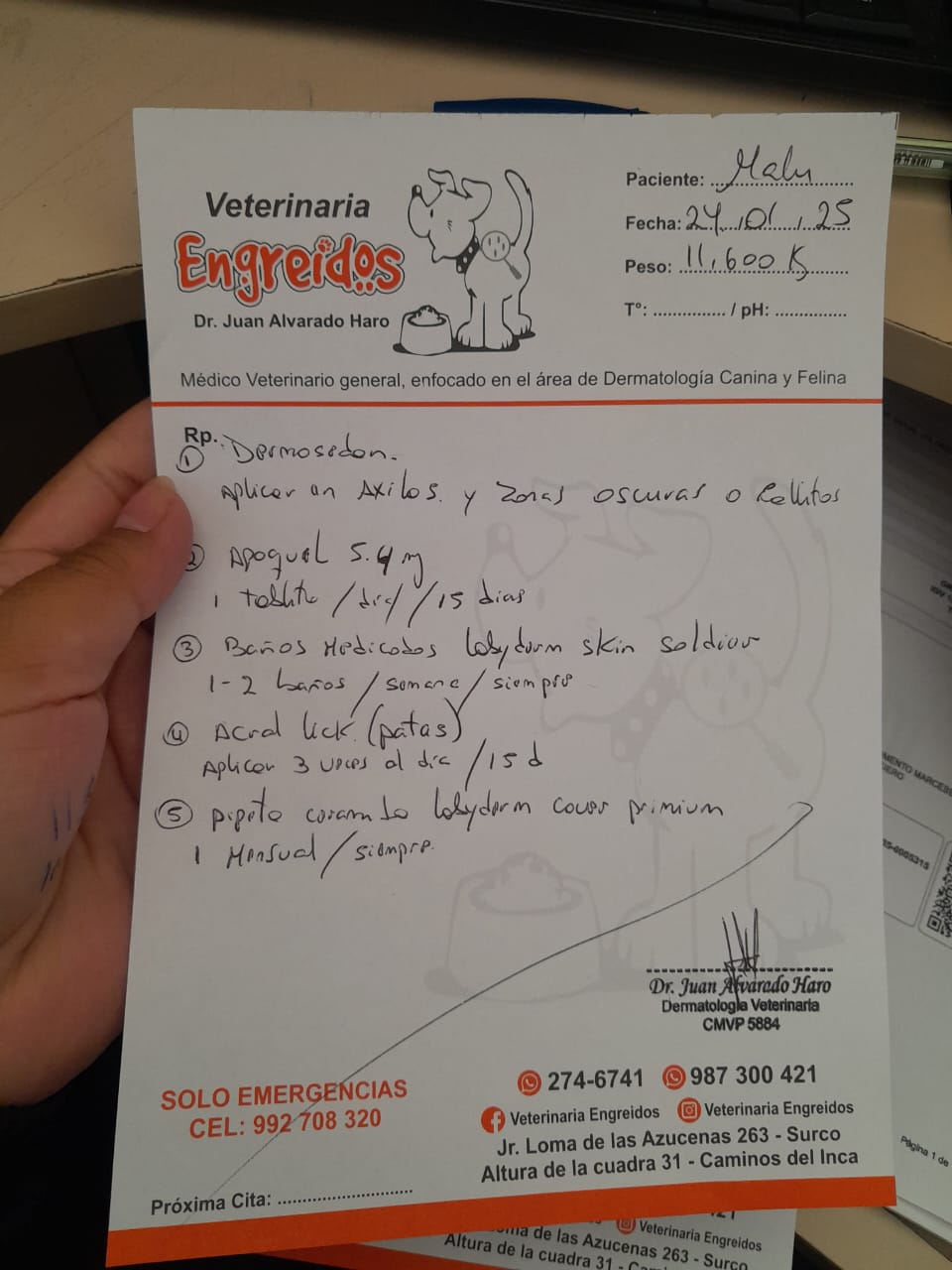 DERMOSEDAN APLICAR EN AXILAS Y ZONAS OSCURAS O ROLLITOS APOQUEL 5.4MG 1 TAB / DIA / 15 DIAS BAÑOS MEDICADOS LABYDERM SKIN SOLDIER 1-2 BAÑOS / SEMANA / SIEMPRE ACRAL LICK PATAS APLICAR 3 VECES AL DIA 15 / DIAS PIPETA CERAMIDAS LABYDERM COVER PREMIUM 1 MENSUAL / SIEMPRE